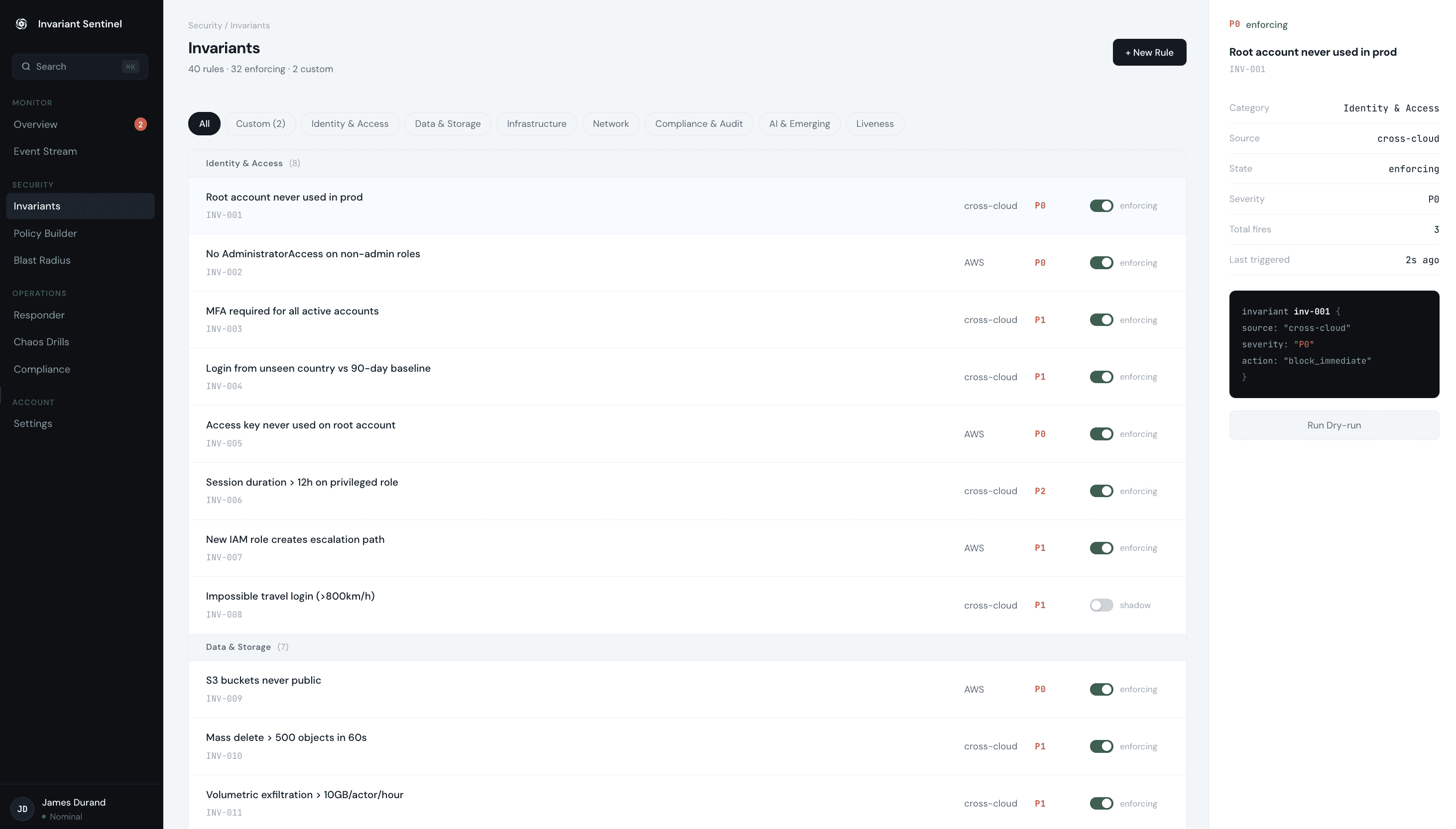 Invariant Sentinel ensures your compute, network, and identity layers never deviate from their secure state.